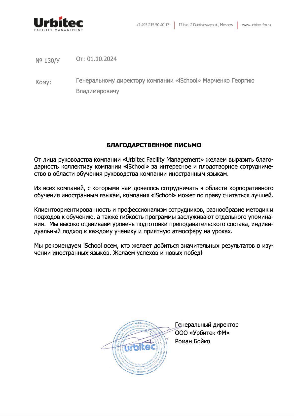 Дополнительно компания iSchool предоставляет круглосуточную поддержку своих клиентов и помощь в проведении презентаций, переговоров и контактах с англоязычными партнерами и коллегами.